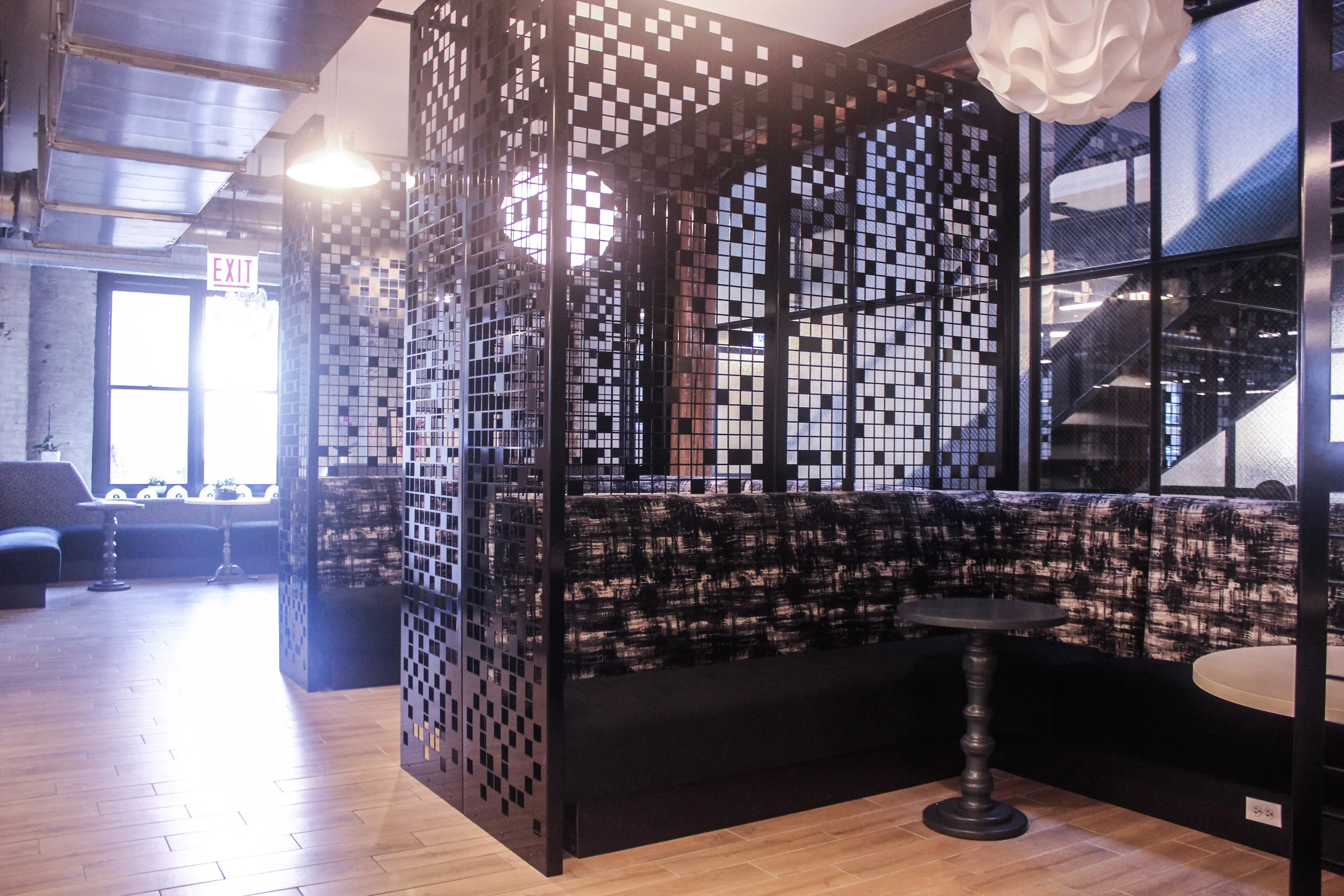 Step into this stunning corporate office and prepare to be wowed by the breathtaking and unexpected geometric metal patterns that adorn every inch of the space. The intricate designs are seamlessly woven throughout, creating a sense of continuity and cohesion that is truly remarkable. From the custom terrazzo floor detail to the mesmerizing honeycomb ceiling panels and sophisticated metal accents found in the banquet seating and custom reception desk, every detail has been thoughtfully and impeccably crafted. The walls themselves are a work of art, featuring a layered walnut wall covering that adds texture and depth to the space. With an originality that is unparalleled, this lobby is a true masterpiece and a testament to the fact that the devil is indeed in the details.