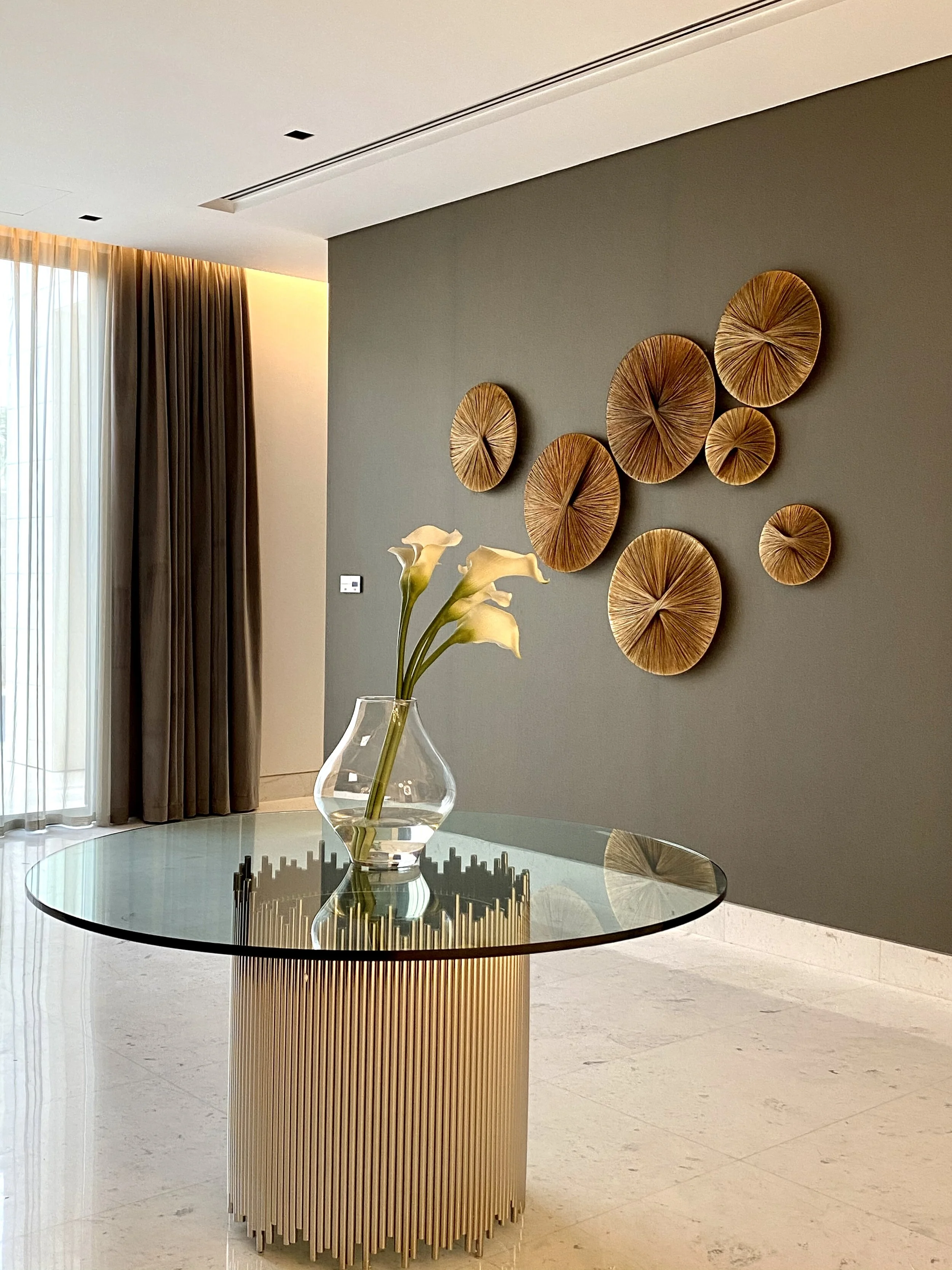 The use of stunning metal round decor in this hallway is nothing short of mesmerizing, with its beautiful textures creating a sense of movement that captivates the eye. The addition of a unique metal base for the round table brings an extra layer of sophistication to the room, with its textural shape seamlessly transitioning the viewer to the outdoor area. A strategically placed vase, filled with the delicate petals of tulip flowers, further heightens the sense of drama and imbues the space with a sense of effortless elegance.